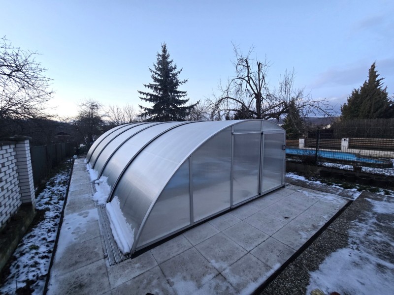 prosklenou zimní zahradou, ze které po schodech sejdete přímo k bazénu a